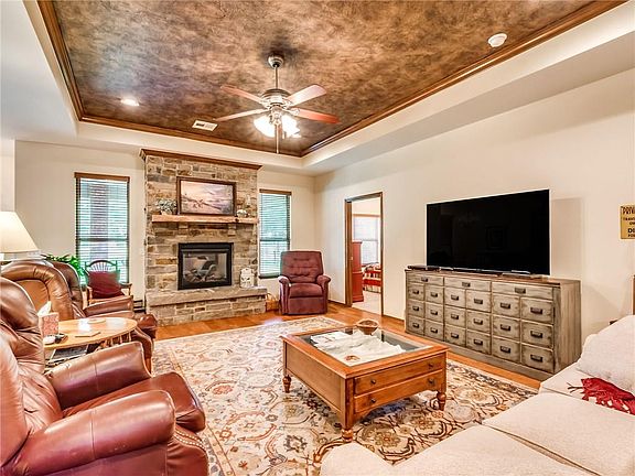 2194 sqft, 3 bd/2.5 ba, 2 dining areas, office/study flex room, large kitchen features walk-in pantry, 2 dishwashers and ample storage. Master bath with fully tiled shower and separate tub, double vanities, 2nd bath with fully tiled shower and 2 large closets. Both baths with wall heaters and heated towel bars. All bedrooms with ceiling fans and walk-in closets. 1250 sqft matching shop, partially open for boat or extra parking. Enclosed portion is insulated with door, sink area with hot/cold water, 220 and 110 electric service, gas, large locking closet, extra storage in ceiling. Lot is 1 acre w/several trees including Redbud and Apple tree. Entire yard sprinkler system; walk-in tornado shelter in garage.