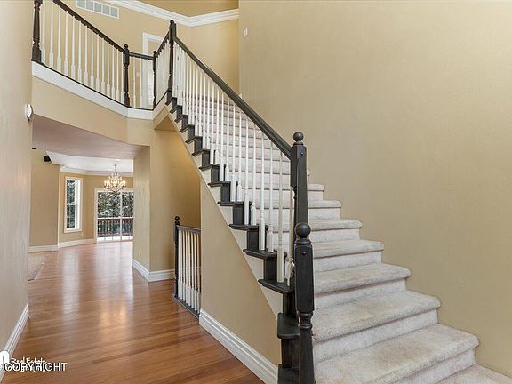 Priced To Sell! This 4,788 SF custom home backs up to far North Bicentennial park w/ expansive trail system. Bike or x-country ski right out your backyard! Tri-level floor plan featuring 4 beds/ 3 full baths upstairs, 5th bedroom, 4th full bath, and family room in the walk-out basement. Main floor w/ kitchen, dining area, living room w/ grand fireplace, office, and mud room off huge 3 car garage.The Masterpiece Homes were known for the "icing on the cake" look with Crown molding throughout the house. The main level has 3/4" solid Brazilian Hardwood Cherry flooring, which have recently been refinished. Wood-burning custom split river rock fireplace by Mark Sprano with Alaska Marble and Granite. Extra support under the fireplace in the basement, specifically for the weight of the fireplace. He came and checked (18 years after installation) after the earthquake. No problems. Level backyard set up for a 100'x33' ICE RINK. Water is plumbed to the little warming hut, buried 18" from the house, and ready for hot water hook up for hot mopping the 100X33 foot wide leveled ice rink. The neighborhood backs up to trail side elementary and shares 2 bike paths to Trailsides playground.