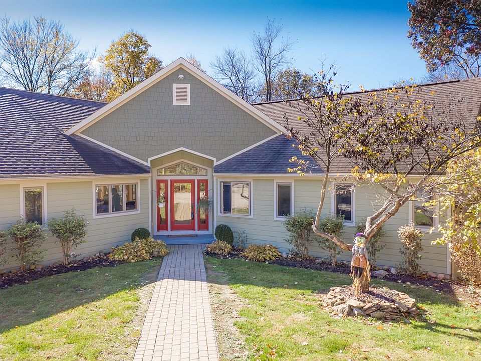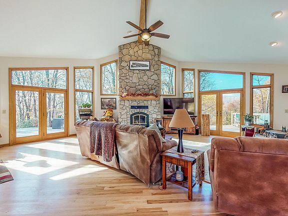 Very special one of a kind ranch style designed home in the middle of 37.98 wooded acres. Quality constructed home with hardwood floors throughout, cathedral ceiling great room opens to dining room, country size kitchen with beautiful natural hardwood cabinets & island. First floor has several doors open to deck and three season room, floor to ceiling stone fireplace sided by many floor to ceiling windows. Owners suites large enough for a sitting area, Walk out basement with family room, 4th bedroom and bath. A view of nature from all windows. Attached 3 car garage, 40'x48' 2 story shop/barn/garage with all appliances and 48' long drive through for fifth wheel or motor home. Country living at it's best, trails cut throughout the woods. Very energy efficient geo-thermal & wood fueled HVAC.