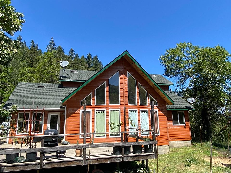 Well built home on 182 acres with reliable well and spring! Nestled amongst the oaks, madrones and fir, the property looks toward the Middle Fork Eel River canyon and offers seemingly endless privacy and space! The home itself has great natural lighting and an open feel, and offers extended outdoor living space with the wrap around decks. There are established garden sites, a small pond, off-grid solar power, and a cabin. End of the road security and privacy. A few details in the home have yet to be completed so there's still room to make this home your own.