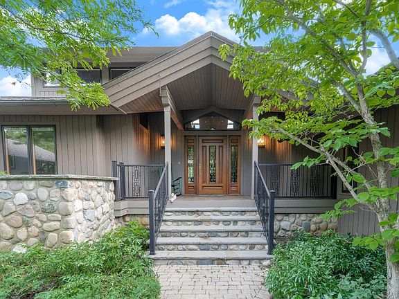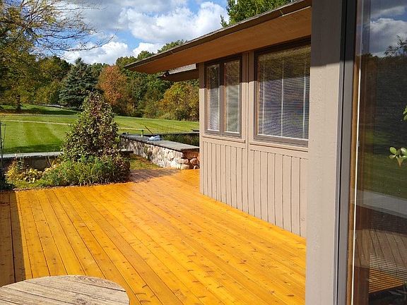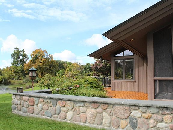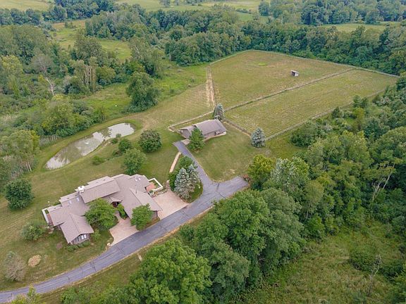Beautiful custom built home situated on 46.24 acres nestled within mature trees and nature. There is a strong influence of Frank Lloyd Wright's architectural design with this 1995 3 bedroom home. Come escape to a home where the natural beauty of the outdoors follows you inside where an outpour of natural lighting follows you throughout the home. Each attention to detail pulls the outside in; the vaulted cielings with mirrored skylights, Pella widnows throughout each room, leaded glass doors, bright and airy sitting sunroom, cozy screened in attached porch, reclaimed wood fire place mantel, timeless decore of nature themed tile within kitchen and dining area, wood flooring/staircase and wood work mouldings/closets. Enjoyable views from within the home, but equally enjoyable on the outside as you stroll along easy to maintain, mature gardens from the front and back of the home. The kidney shaped pond is perfect for swimming, or fishing(stocked w/fish) and has an aerator that is easy to remove for the winter months. The detached barn just to the back of the home, can house your horses/livestock or toys, and has easy access to upper loft to load your feed and bedding. Paddocks/pastures/autowater.