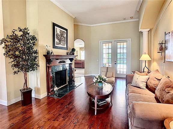 Keene's Pointe - gated/24 hour attended golf course community. This charming home located on a quiet cul-de-sac with OVERSIZED YARD offers 4 bedrooms/4 baths with formal living/dining rooms, an office, and upstairs bonus area with full bath. Perfect for entertaining, this open floor plan features spacious dining and living areas with gas fireplace, and kitchen with granite countertops, updated stainless steel appliances and a breakfast bar overlooking the spacious family room with French doors to the lanai. The first floor offers a split bedroom floor plan with two bedrooms and adjoining bath, fourth bedroom with a full bathroom, and the master suite privately situated on the opposite side of the home. The generous sized master offers a tray ceiling, access to the pool area, large walk in closet and a bathroom with two vanities, jetted tub and large shower. The upstairs features the bonus area with full bath and can also be used as a play room, media room, hobby area or fifth bedroom. The back yard is private and features a screened swimming pool with new decking overlooking the large back yard. Three-car garage, new carpeting, front door, roof and AC systems are just a few of the extras in this home. Located close to shopping/dining, expressways and tourist attractions, as well as The Golden Bear Club, an 18-hole golf course designed by Jack Nicklaus featuring golf, tennis, fitness and dining, available with separate membership.