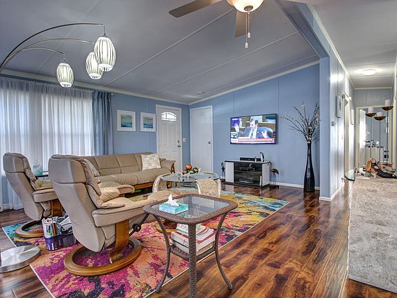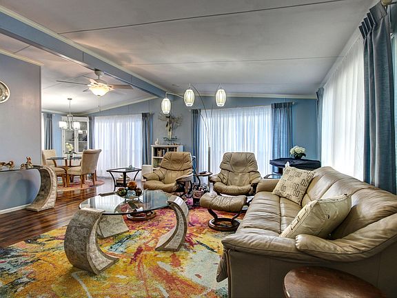 Incredible location on Old Stage Rd-Nearly Completely Remodeled-Backs to open space! Welcome to the highly sought-after 55+ community of Madrone Hills Mobile Park. This incredible residence has undergone a complete transformation, boasting an array of upgrades. The kitchen now features new countertops & repainted cabinet doors & new sinks & cabinets in both bathrooms. Newer: Laminate flooring in the living room & vinyl in the kitchen, interior doors, skirting, outlets, paint (both inside and out), light fixtures, & baseboards plus much more. Enjoy the convenience of a newer roof and refreshed decks. The backyard offers a stunning, unobstructed view with frequent visits from birds, deer, and turkeys. Beautiful garden and custom sidewalks. Additional perks include two storage sheds and the delightful amenities of the community, such as a garden, clubhouse, and a fenced RV storage area. Please bring your clients, they will love it.