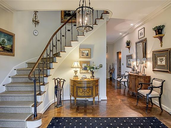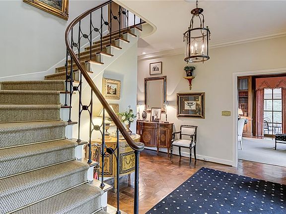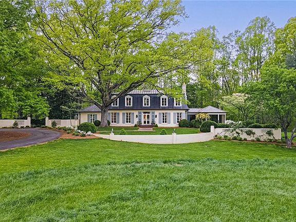Set on a knoll among rolling pastures and woods is this charming French inspired home. Custom designed and built to exacting standards, the interior has an elegant yet livable design with large rooms, beautiful millwork, hardware, and finishes. The living room is highlighted by its handsome raised paneling, large window, and marble fireplace. The adjacent sunroom, filled with light and 360° beautiful vistas, features a granite bar with copper sink. Other rooms on the main floor include the dining room with hand painted panels and built ins; a study/4th bedroom with fireplace and large window that overlooks a shade garden; a full bath; and renovated eat-in kitchen with honed granite countertops. A large primary with fireplace and new bath and 2 additional bedrooms and bath are upstairs. A footpath leads to a stocked pond. Offered only the second time in its history, this is truly a Forsyth County landmark and minutes from major shopping and medical centers.