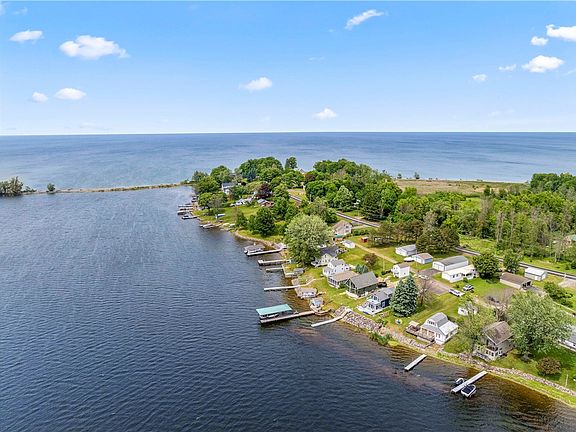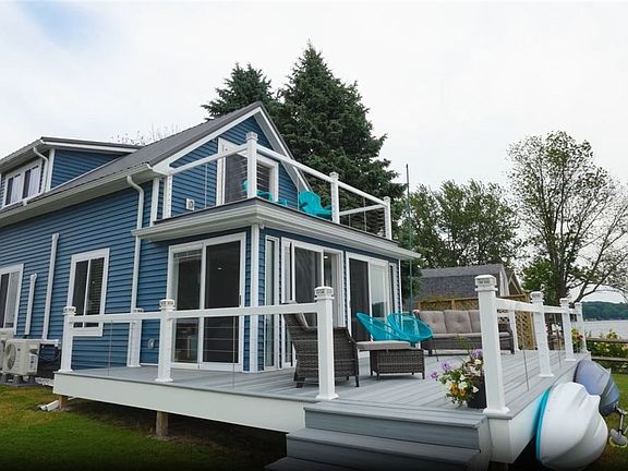 * P R I M E * W A T E R F R O N T * Immaculately remodeled home with 61’ of level waterfrontage. 180-degree breathtaking views of Port Bay & Lake Ontario. Brand new 35’ floating dock. Double-wide lot offers ample space to add a garage. This home has been COMPLETELY renovated w/ open floor plan & exquisite attention to detail throughout. Entry mudroom/laundry room leads to stunning quartz kitchen w/ stainless appliances, breakfast bar, tile backsplash, pantry, & coffee station. 5 sliding glass doors w/ built-in blinds provide access to upper & lower-level decks. Both baths offer custom tile walk-in showers w/ built-in seating & shelving. 2nf flr has custom tile floor (gorgeous!). All new in last 2 yrs: 220 elec, Pex plumbing, metal roof, vinyl siding, sewer tie-in, retaining wall w/ stairs & Trex landing, floating private dock, 3 Trex decks (front, back upper & lower wrap-around), 3 split units for heat & AC, windows, LVT flooring, 4-car driveway, custom window blinds, EVERYTHING!! Whether you’re looking inside this home or out at a calming sunset, you will not be disappointed. This place is perfection. Showings begin 2pm 6/9, offers due 10am 6/17. Total sf includes 128 sf addition.
