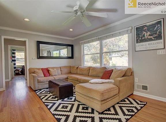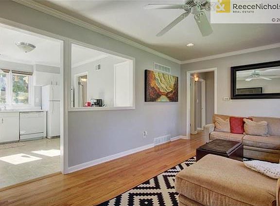 Scoot your Boot here! Today's colors throughout, hardwoods, & kitchen open to living space. Remodeled bath. Flexible bedroom space off kitchen (currently serving the home as dining + additional living space). Ample outdoor living space + fenced yard and loads of storage in full basement.