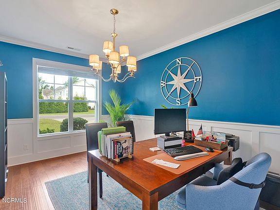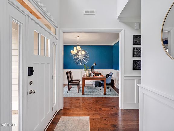 This craftsman style home instantly welcomes you with a rocking chair front porch and the two-story foyer! First floor presents 9' ceilings with crown molding, 5'' pre-engineered floors in the main living areas, and a gas fireplace flanked by nautical custom built-in cabinets. Kitchen features beautiful white and grey cabinetry, quartz countertops, a wall oven and smooth cooktop, subway tile backsplash, recessed lighting, and stainless-steel appliances. Downstairs includes a guest bedroom with bathroom and an office that could also be used as a workout room or playroom. The large master bedroom upstairs has an ensuite bathroom with a double vanity, tiled walk-in shower, large soaking tub, and a huge walk-in closet with custom built-in shelving. Upstairs, you will also find three additional bedrooms and two bathrooms. The spacious screen porch leads to a patio and large fenced in backyard, perfect for entertaining. Ideal location in the heart of Porters Neck- convenient to shopping, great restaurants, grocery stores and a short drive to Wrightsville Beach, Surf City or the Topsail Beaches!