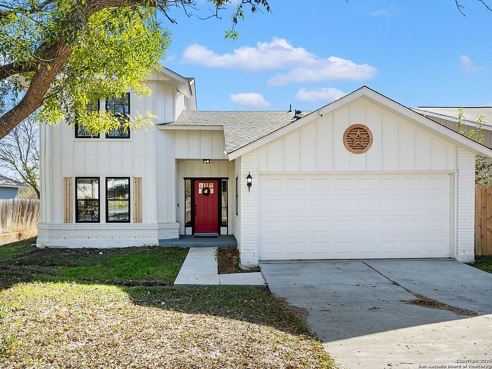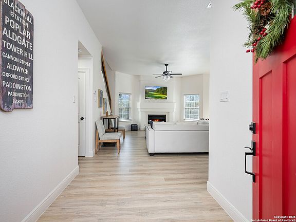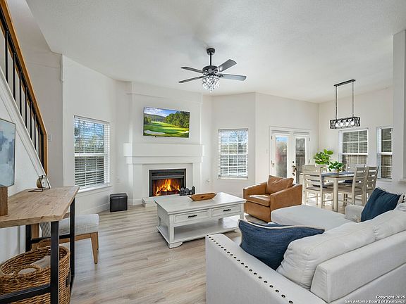 Welcome to 8403 Maple Ridge - a rare combination of meaningful upgrades, functional layout, and privacy. This turn-key, 3-bedroom home offers long-term peace of mind with a new roof, energy-efficient double-pane windows, and refreshed exterior finishes that deliver strong curb appeal. Designed for modern living, the interior features an open-concept layout, high ceilings, abundant natural light, and a central brick fireplace anchoring the main living space. The kitchen is a true highlight, showcasing quartz countertops, classic timeless tile backsplash, soft-close solid wood navy cabinetry with modern hardware, stainless steel appliance package, and a spacious walk-in pantry with custom shelving-ideal for everyday living and entertaining. The primary suite is conveniently located on the main level, offering a private retreat with a well-appointed bath featuring double vanities, a separate water closet, custom tile finishes, and a generous walk-in closet. Upstairs, two additional bedrooms provide flexibility for guests, family, or home office use, while durable, stylish flooring runs throughout the home. Additional features include an attached two-car garage and private driveway, offering everyday convenience and ample parking. Out back, enjoy a spacious backyard with full wood privacy fencing and no rear neighbors, providing the level of privacy today's buyers are seeking. Designed for comfort, efficiency, and easy ownership, this move-in-ready residence presents a compelling opportunity for buyers seeking quality, thoughtful upgrades, and functional space in an established San Antonio location.