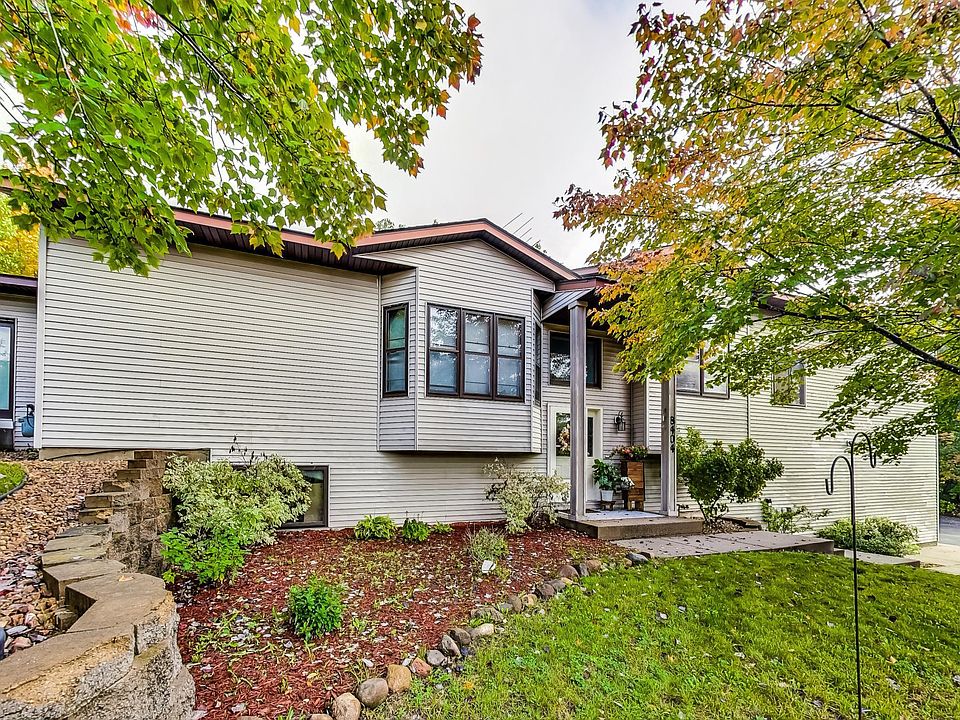 Spectacular Mississippi River views on the 2+ acre wood riverfront property. Spacious and open designed home with views from many rooms. Main floor family room. Living room, dining room and kitchen plus 4 season porch all open to each other. The kitchen has terrific counter work space and cabinetry. Dining space large enough to expand for the big group. The 4 season porch has a gas fireplace, vaulted ceilings and opens to a large two level deck. Three or four bedrooms on the main level and a full bath. Huge primary bedroom with walk in closet space. The fourth bedroom is also huge just freestanding closet so could be office/exercise room or.. Large storage extra pantry area off of the living area too. New carpet in several rooms. The lower level is a walkout with two additional bedrooms plus office. Full bath jetted rub. Oversized 2-3 car garage double deep for cars/workshop area. Mud room off garage and the walkout. Put your canoe or kayak in and enjoy the river!
