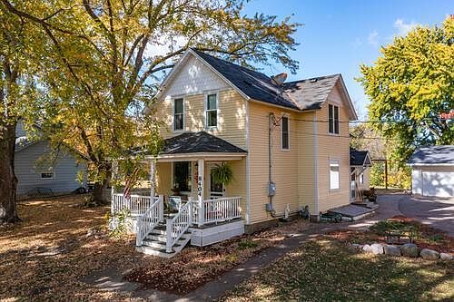 Spacious Home Inside & Out! Covered Welcoming Front Porch while Peaceful Privacy Prevails on backyard brick patio with"Outdoor Kitchen" and shaded dining area. A stone patio continues into the sunshine ,fire pit along boulder wall, raised garden, swing set and 8 x 7.5 garden shed. Just a block from Dakota Hike/Bike Trail System. Your own "mini resort"! The "Heart of the Home"Kitchen will win you over the moment you step inside. Very open to both the familyroom & main dingingroom. Newer addition built with the charm of yesteryesr. Farm style sink among detailed woodwork from waincot,shelving,sliding barn door, & center isle with old style table legs. Old world charm in keeping with yr built of home with top of the line appliances! Very spacious diningrm along a wall of windows on rich hardwood flrs with a Den convenient half bath off. (could be used as main flr BR ) Livingrm off roomy front porch with open staircase flooded with plenty of natural light. Stunning Primary suite with detailred vaulted & beamed ceiling- a major focal point ending with three staggered windows at the end of the room viewing over the backyard. Great restoration Turn of the Century Home- A Must See!