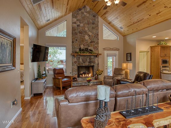 Single level home in Pinetop Country Club. Cedar siding (stained 2019). Covered decks front and back. Landscaped w/drip system which was installed by In Bloom nurseries. Trees have underground drip. 24X24 oversized garage. T&G vaulted ceilings, wood flooring. Kitchen has knotty alder cabinets, quartz counter tops. All new stainless appliances including Jenn-air gas stove. Access to back deck off of Master bedroom. Utility room w/washer, dryer and small desk area. Complete interior paint 2018. Very well maintained. Full house surge protector on electrical panel. Within walking distance to National Forest. Jackson tank is right across the street. Close to private and public Golf and Country Clubs, hiking and biking trails. BEING SOLD FURNISHED. Property is occupied. Please use showing time.