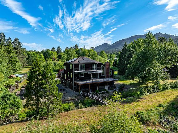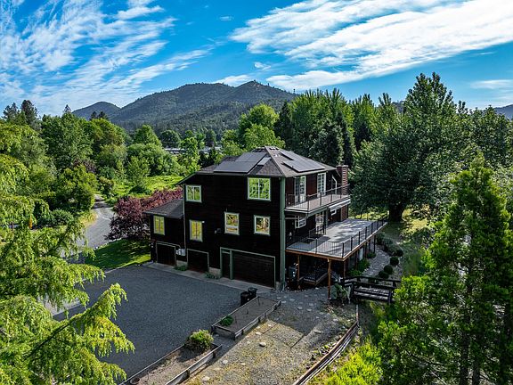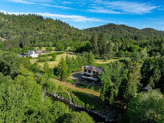 Beautifully custom-built home on the scenic Applegate River, offering 2,437 sq ft of thoughtfully designed living space with 3 bedrooms and 2 baths. Built in 1995, this riverfront retreat features expansive windows that showcase breathtaking 365-degree views year-round. Relax on the newly completed back deck as the river flows by, or enjoy the updated entryway with new front steps, balcony, and entry door. The property is rich with unique features, including a small water tank swimming pool, a serene treehouse yoga/meditation retreat, and a charming guest house. Sustainable living is made easy with new solar, stand-alone generator, and a drive-thru garage. Additional highlights include a picturesque pond, chicken coop, and raised garden boxes—ideal for those seeking peace, privacy, and self-sufficiency in nature's paradise.
