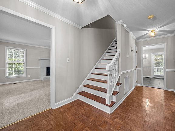 Nestled amidst hardwoods, pines, and magnolias is a bridge between yesterday and tomorrow. Lush foliage surrounds this cottage and hides it from the rest of the busy world. The open entry hall is flanked by the primary suite on the right, while the expansive living room with fireplace, and the bright dining room occupy the left, where wainscoting and a brass chandelier perpetuate the comfortable atmosphere. The sparkling grey and white kitchen and breakfast room, with tile floors, opens to the deck that extends across the back of the house overlooking a large backyard and various garden spaces that lead to a small storage building. A spacious laundry abuts the kitchen and also offers access to the deck. The two upstairs bedrooms, which share a spacious bathroom, have quaint, sloped ceilings and charming window nooks provided by the dormer windows. This cottage is move-in ready with fresh paint and new carpet throughout. This property offers tranquility with a country feel on an almost ¾ of an acre lot as well as the convenience of being close to Apex, Fuquay, and 540 for Triangle commuting. Whether you want to dream like you live in the past as you wander around in the lush backyard gardens or relish in the moments of present day looking toward the future, 8405 Bells Lake is the answer.