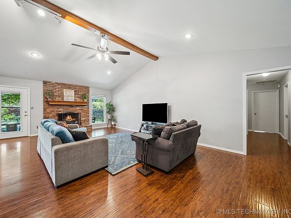 Great location in Bixby Schools with easy access to restaurants and shopping! Beautiful perennials and raised bed in backyard for color and easy care. Lots of dining area for sit-down gatherings includes a bar, small table and large table areas. Granite counters and stainless appliances in kitchen. Wood laminate flooring and tile throughout. Bedrooms are spacious and have great closets. Living room has vaulted ceilings and gas fireplace. Small park just down the street. This is a beautiful respite in a busy world.