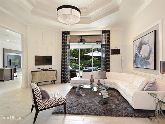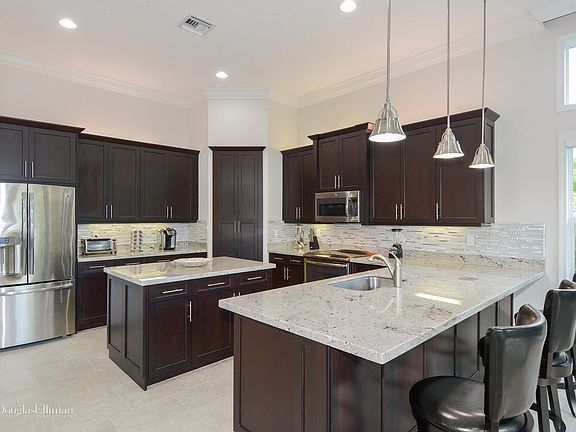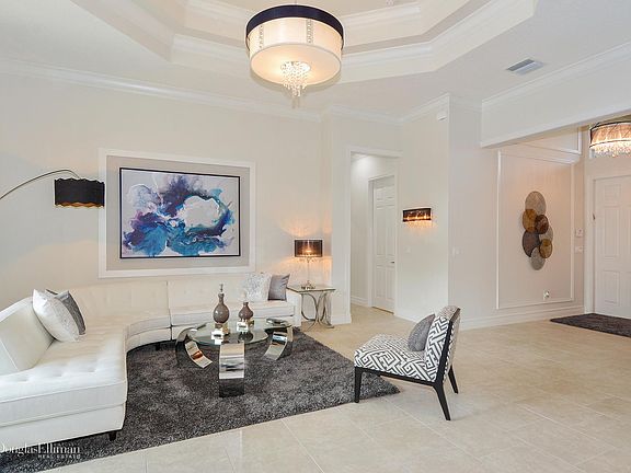 Valencia Cove. Customized Lydia Model with Open Floor Plan located on Oversized lot in heart of Cul-de-sac with total Privacy and Water View!All Designer $$$$$ Upgrades and interior finishes. Designer Lighting Fixtures and fans throughout. Custom Window Treatments, with Designer Fabric Drapery. Crown and Wall Moldings throughout. Built-in custom wall units. Upgraded Kitchen Cabinets, Countertops, and backsplash. Upgraded Baths. Upgraded Alarm system with Closed Circuit Security Cameras with 24/7 Video. WiFi thermostat Control. Lush Tropical professionally Landscaped property. Accent Outdoor Lighting. Upgraded Pavers, Custom Patio. One of a Kind. Must See. HOA includes Cable Comcast Service. 55+ Lifestyle Community
