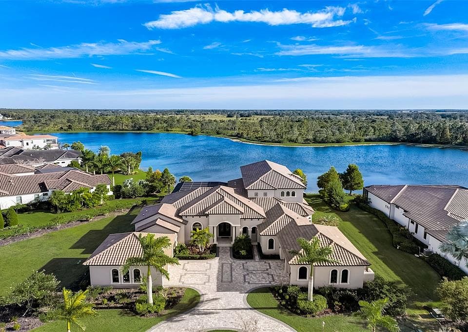 The Concession has been ranked as one of the TOP 10 Golf courses in Florida. When rivals collaborate, boundaries are broken and something special happens. The Concession Golf Club in Eastern Manatee County is the culmination of years of planning and design by Jack Nicklaus and Tony Jacklin, resulting in the ultimate tournament level course, surrounded by exquisite natural beauty. The estate homes in The Concession are an extension of that drive for excellence. Beyond the norm of luxury and with no homes surrounding the courses for ultimate privacy, homes throughout the community are examples of masterful design and uncompromising craftsmanship. 8407 Broadstone Court is a sprawling Mediterranean estate, situated on a picturesque 1.5 acre lot with long lake views to the Southeast, for the morning sun to welcome each day. The home encompasses 10,213 square feet, with 6,816 square feet under air, offering 5 spacious bedrooms and 6.5 luxurious baths. Richly finished with the finest of materials and attention to detail, the arched, wrought iron front door opens to soaring ceilings, open spaces with clean site lines and architectural details befitting a luxury estate. The kitchen is a dream for entertaining and enjoys open design for effortless flow to conversation spaces for lively parties or quiet evenings with family and friends. Expansive gleaming quartz surfaces perfectly complement the rich wood tones of the espresso cabinetry and stainless appliances, including a 6-burner gas cooktop with griddle, steam oven, hidden walk-in pantry, and Sub Zero Refrigerator and Sub Zero Freezer. Picturesque views of the tranquil lake are a feature throughout this home, and those views are on full display through panoramic screens that frame the lanai. The heated, salt water pool and spa are a classic Roman design and are accented by a built-in fire table for cool evenings and a 2 spacious lanais with access to the well-equipped Summer kitchen from one, and to the Primary Suite from the other. The primary suite is a palatial retreat, with a light-filled sitting room and a luxurious spa bath. 2 additional bedrooms(1 en-suite) are found on the first floor, with a well-appointed office and a bonus room downstairs as well. Upstairs are 2 more spacious guest rooms, a 2nd bonus room, and a perfectly positioned balcony to enjoy those sunrises over the lake. The home includes garage spaces for 4 cars, 2 EV charging stations, and enjoys a long pavered drive with a circular approach to graciously host parties and events. Need additional garage space? Build your dream garage or a guest casita! The Concession is a very special gated community, bistro restaurant onsite, along with a premium on privacy, luxury, and an elevated lifestyle, while enjoying close proximity to all of the amenities of the area, including award winning Lakewood Ranch, Sarasota and the diverse arts community, and Bradenton’s beautiful beaches. Unbelievably, this home has only been occupied 3 months in total. Wonderful chance to basically purchase new construction on acreage. Please click on the 2nd Virtual tour for an interactive floor plan experience and new pictures.