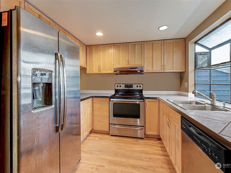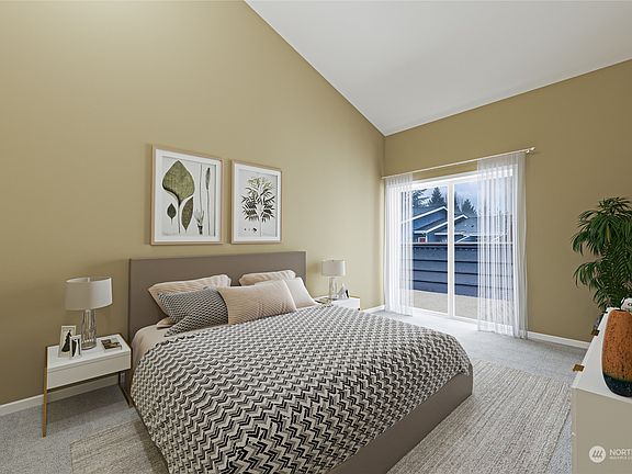 Excellent opportunity near Paine Field and Walter Hall Golf Course! 2 bedroom/2 bath condo with no rental cap. $18k in new windows. Updated kitchen. Individual garage. Washer, dryer, refrigerator, stove and dishwasher all stay. Primary bedroom features a slider to the balcony, full bath with double sinks, a walk-in closet, and access to a finished storage area in the attic. Great room concept with wood burning fireplace. Large deck area by front entrance - perfect for gatherings with friends. Spacious second bedroom offers access to the deck.