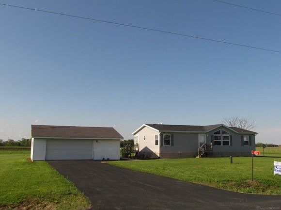 3 bedroom 2 bath manufactured home with no basement, featuring kitchen with center island, split bedroom design, master suite with private bath, vaulted ceilings, dining area with patio doors leading to deck, all on 1.64 acres with 2 stall detached garage and 2 storage sheds.