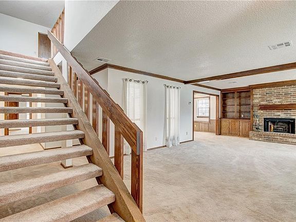 UNDER CONTRACT. TAKING BACKUPS. Master Bedroom is huge, has its own fireplace & private large bathroom with updated shower and dressing area plus large walkin closet, and brand new carpet. Master has access to the atrium through new garden doors. Living Room is massive with fireplace and lots of windows. Formal Dining Room w/new light fixture and access to the atrium. Kitchen is large with lots of counters & cabinets, new range & stove, new flooring, casual dining space, interior utility w/new washer & dryer connections, and french doors to the backyard/patio. Upstairs houses an enormous bonus/bedroom plus another huge room off the bonus room, great for a private office. There is a delightful balcony off the bonus room overlooking the atrium for private relaxing. Garage floor Storm Shelter. BRAND NEW HVAC upstairs and downstairs & new duct work. Newer hot water tank, hall bath remodeled, new paint, whirlpool tub, & tons of storage throughout. Alarm. BUYER TO CONFIRM SCHOOL.