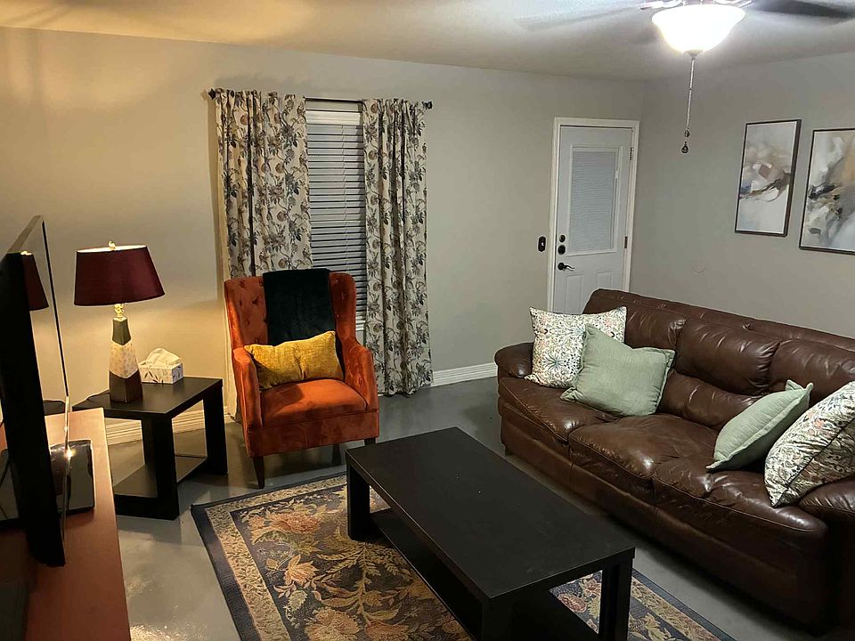 Beautifully furnished, fully remodeled home with modern upgrades throughout. Features include polished concrete floors, quartz countertops, fresh interior/exterior paint, updated lighting, ceiling fans, new doors/baseboards, and a new A/C system. Kitchen includes a stainless steel fridge, and the home comes with an in-unit washer & dryer. Both bedrooms offer spacious closets and great natural light.