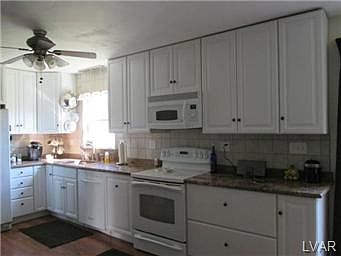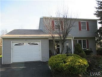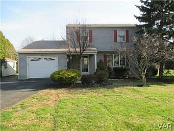 Move in ready colonial situated on 2/3rd acre lot with One Year Upgraded Home Warranty package. Remodeled kitchen w granite counter tops, new appliances, stainless steel sink w disposal, hot water dispenser, pergo floors. Open concept to diningrm. Remodeled half bath located off of 1st fl family room, which could also serve as an office, playrm, or convert to 4th BR. Two large sliding doors provide great lighting lead to large private back yard, w swimming pool w deck, two sheds, and plenty of yard space leftover! 3 bedrms served by remodeled hall bathrm w separate entrance from master bedrm. Plenty of closet space and attic storage above garage. Refinished basement w family room includes a separate laundry room, workshop and storage rms. Sump pump with battery backup system. Most rooms freshly painted (2014); Newer Roof (2009); new pool liner (2010); Central Air (2005), Newer carpet (2006). Home in quiet neighborhood yet close to Rt 78, Rt 309 and PA turnpike. This is a must see!