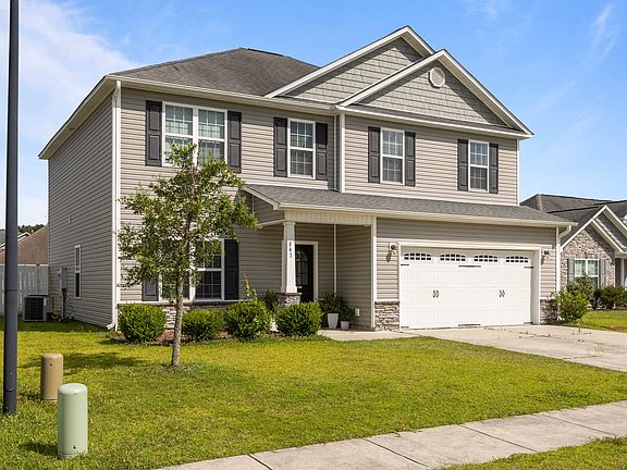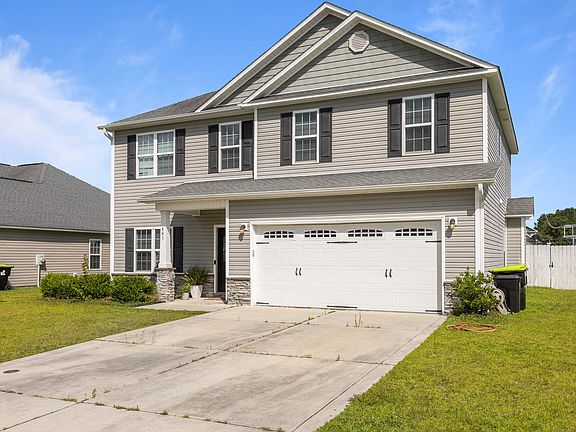 A charming, modern four-bedroom house, nestled in a quiet suburban neighborhood located in Carolina Plantations. The house boasts a spacious loft area that provides additional living space upstairs, and a cozy living room with a roaring fire. The backyard is privacy-fenced with a covered patio and ceiling fan, perfect for family gatherings.