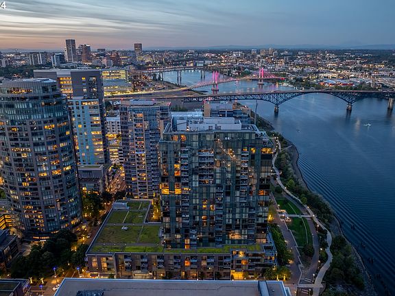 Perched high above the banks of the Willamette River in coveted Atwater Place, this pristine corner unit pairs premium finishes with breathtaking views that stretch from Mt. Hood to the West Hills. Offered fully furnished and completely turnkey, this home presents a rare opportunity to experience unparalleled waterfront living. Inside, beautiful pale hardwood floors complement wraparound windows that afford sweeping 180-degree views and flood the space with natural light. Witness daybreak over Mt. Hood from the glass balcony, the perfect space for outdoor dining backdropped by stunning river views. In the evening, unwind by the fireplace as the sun dips behind the West Hills. Motorized shades, a Nest thermostat, and a multi-room sound system allow for maximum control and comfort. The gourmet kitchen has been impeccably remodeled with striking Saint Laurent marble countertops and backsplash, quarried from the Pyrenees mountains of southern France. High-end appliances, including a Wolf induction cooktop and Viking oven, complement a generous island with a built-in wine cooler. The luxurious primary suite features serene river views and a walk-in closet, along with a dual vanity, soaking tub, and tiled shower. Additional spaces include a guest bedroom with an en suite bath and a spacious den/home office, both with floor-to-ceiling views of the West Hills. The unit also includes two deeded parking spaces equipped with a Tesla-compatible EV charger (integrated with the EverCharge system for convenient charging and automated billing) as well as ample storage. Atwater Place offers a 24-hour concierge, security, a well-appointed community room, and beautifully landscaped grounds. Ideally located in the vibrant South Waterfront neighborhood with easy access to riverside walking and biking trails, a local farmer's market, and an array of shops and restaurants. The Portland Streetcar provides a seamless connection to downtown, with Lake Oswego just 15 minutes to the south.