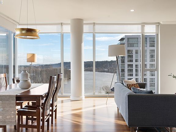Perched high above the Willamette River in the coveted Atwater Place, this rarely available SE corner residence blends sophistication and serenity. Walls of glass frame sweeping 180-degree views, where the morning glow over Mt. Hood meets the shimmering waters stretching toward the Sellwood Bridge. Designed for effortless, single-level living, this exceptional retreat pairs modern luxury with timeless elegance. Brazilian cherry hardwoods flow through the open living space, bathed in natural light from floor-to-ceiling windows. A gas fireplace creates a warm ambiance as the sun sets behind the mountains, while the private glass-walled balcony invites al fresco dining with ever-changing riverfront scenery. The gourmet kitchen is a culinary masterpiece, featuring granite countertops and backsplash, a custom island with a built-in wine cooler, premium appliances, and ample storage with custom cabinetry and a spacious pantry. Whether hosting or enjoying a quiet meal, this space blends function with impeccable design. A serene escape, the primary suite offers river views and a flexible space for a sitting area, home office, or gym. The spa-inspired en-suite bath boasts a dual vanity, soaking tub, tiled shower, and walk-in closet. The well-appointed guest bedroom includes an en-suite bath for ultimate privacy. A versatile den/office provides space for a library, media room, or creative studio, all with breathtaking river views. Two deeded parking spaces near the elevator and an oversized storage unit enhance convenience. Atwater Place offers premier amenities, including a 24-hour concierge, security, a community lounge, and lushly landscaped grounds. Steps from riverside trails, vibrant dining, the Portland Streetcar, and the OHSU aerial tram, this home offers a lifestyle of convenience and connection. Experience the pinnacle of waterfront living, where breathtaking views and refined elegance converge.