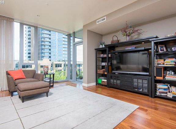 Spacious corner home with floor to ceiling windows and a river view! 2 large bedrooms with oversize walk in closets both overlooking the private courtyard. Stainless steel appliances, large laundry room with lots of storage. Designer colors, hardwood floors and high end window treatments to be included. Balcony off living room with great river view. Perfect condition! Just steps from greenbelt and Willamette River. Tandem 2 car deeded parking