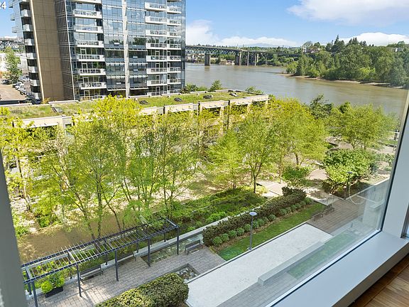Fantastic one bedroom home in the highly desirable Atwater Place with beautiful views of the Willamette River! Welcome to the best of South Waterfront living - enjoy panoramic views of the river, city bridges, and lush greenery from this peaceful home. This great floor plan offers a spacious primary suite overlooking the scenic green eco-roof with a walk-in closet & bathroom w/ double sinks, kitchen w/ large island, open living space, built-in desk with ample storage, a covered deck & additional half bathroom. New interior paint throughout and complete with one parking space & indoor storage unit. Relish living in this unbeatable location just minutes to restaurants, fitness studios, OHSU, downtown PDX & more.