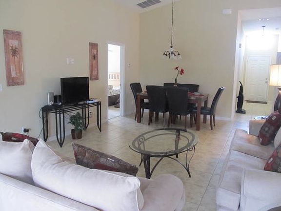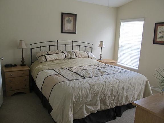 Ready to move in... this fully furnished home has 5 bedrooms and 3 bathrooms, the master bedroom has a king size bed, walk in closet and en suite bathroom, another bedroom has a queen bed and en suite bathroom, 1 has a full bed with adjoining bathroom and 2 rooms have twin beds. Kitchen is fully equipped and includes a coffee maker, microwave, dishwasher. and there is also a washer and dryer. There is also a breakfast area in the kitchen. The patio door in the family room opens up to a screened in deck with a pool and spa which can be heated in the cooler months and patio furniture. Tenant responsible for electric, water and phone. Cable and pool and lawn maintenance included.