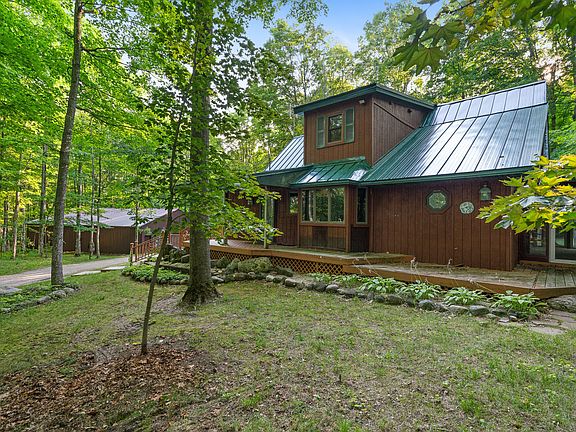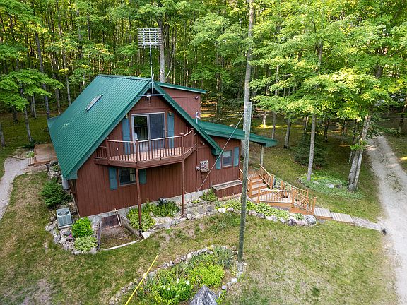 Are you looking for that special home nestled in the woods with a pole building ready for all of your toys? This 2 bedroom, 2 bathroom home, located on a paved road between Indian River and Wolverine, offers 41+ acres of wooded land with trails to explore.The main floor consists of a custom kitchen, entry, guest bedroom, full bath with independent garden tub, dining room, and a living room that extends to an amazing 16'x24' screened porch, providing wonderful views of the natural setting. The upper level master suite even has a private balcony. The 40'x50' pole building with an additional enclosed 12'x40' bay is to be envious of. The main building has 5 overhead doors providing storage, a workshop, a garage, or a variety of uses while the addition has 1 rear door. A must see property.