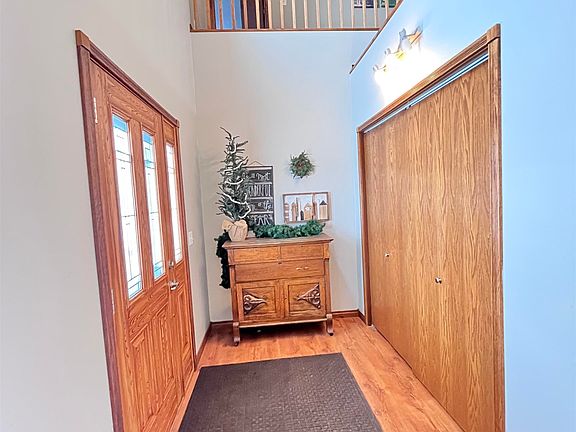 Gymnasium, game room, movie theater, large family room, floor heat in the garage, geothermal heat....what more could you ask for? It's hard to leave the house when you own this home as it so spacious and offers so much to do. Large, spacious 5 bedroom, 3 bath house, located on a peaceful 2 acre lot with an attached 3 car garage offering geothermal heating system plus basement and garage heated floors, with an added storage shed in a large backyard. 18ft ceilings accompany the grand entrance, and windows are outfitted with cellular blinds throughout. The deluxe kitchen comes with pull out drawers in lower cabinets, an induction stove top, wall oven, and a Bosch 16 set dishwasher. In addition, there are 2 home office stations with a large window, a fun family room, gym, game room, and a state of the art movie theater with projector and surround sound. This house offers main floor laundry but with the convenience of a 2nd floor laundry shoot. The downstairs level also includes an entertainment area with a wet bar and plenty of room and possibilities for hobbies or just relaxing. With 3 raised garden beds in the backyard, an additional storage shed and a beautiful view from the covered porch, this unique house offers a living style of both luxury and practicality, without leaving out the fun! All windows have cellular blind and all bedroom windows have day/night Cellular blinds which adds to the economical efficiency of the home. Entire home is heated with geothermal heat. MAIN FLOOR:You are greeted with grandiose 18 foot high ceilings as you walk in to the dining room and kitchen. There is a window in the dining room where you can view the gymnasium on the lower level. The kitchen cabinets below all have pull out drawers. The kitchen has an induction stovetop, a Bosch top of the line 16 set dishwasher, built in trash bin and wall oven. Laundry and pantry room Full bathroom and the door to the 3 car garage. BASEMENT: Game room with wet bar and cabinets, pool table or if you chose a workout room or put tables for hanging out with friends or a second living room Movie theater with a movie projector with surround sound speakers. Gymnasium. 18’4’’ ceilings. 22 x 38 space for enjoying baseball or softball there's a net to have a pitching machine, there's a basketball hoop, and there's also nets to play badminton or whatever you choose. The entire basement has floor heat. The 3 car garage has 11 foot ceilings with overhead storage, a built in work bench, storage cabinets with a sink with cabinets and floor heat. The garage is 25 deep in stalls and 19'8''for the other stall. Although it's never been needed, the last owner had the house prepared to hook up a generator. The second parcel being sold with the property has room to build a large storage or workshop if so desired.