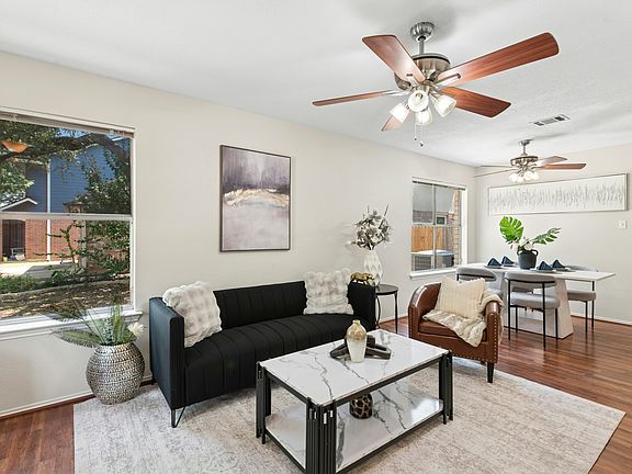 Welcome to 8411 Glen Canyon Dr, a beautifully maintained 4-bedroom, 2.5-bath home in the highly desirable Fern Bluff neighborhood of Round Rock. The front exterior boasts a sleek, modern brick facade in black and white. Step inside to find a bright and open layout with no carpet throughout the entire home easy to maintain and ideal for modern living. The kitchen opens to the dining area and features an island. One of the standout features is the enclosed sunroom, which is filled with natural light and offers a versatile space for relaxing or entertaining. Upstairs, the bedrooms offer privacy and ample storage, including a primary suite with a walk-in closet and a dual-sink vanity. The backyard provides shade from mature trees, creating a private retreat to enjoy year-round. Located within Round Rock ISD's top-rated schools Fern Bluff Elementary, Chisholm Trail Middle, and Round Rock High this home is perfect for those seeking both a lifestyle and a great location. The owner will maintain the landscaping