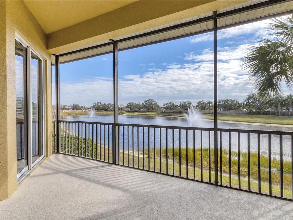 Enjoy the water views on the screened balcony in this spacious 3 bedroom 2 bath plus den Lakewood Ranch condo. The 1,812 sqft unit is a split floor plan that has newer carpet in the bedrooms and luxury vinyl flooring in the main living areas including the den. The office/den with double doors has access to the spare bathroom. The primary bedroom has two walk-in closets, a water view, and access to the screened balcony. The kitchen includes a breakfast bar, pantry, built-in desk, and an eating area. The main living area is spacious with great lake views. The unit is above the attached one-car garage with a private driveway. In-unit laundry room. This gated community offers a heated swimming pool, hot tub, fitness room, indoor and outdoor kitchen, clubhouse, and guest parking within a short distance from the condo. Applications and credit/background checks are processed through the homeowners association. LEASE TERMS: minimum 7 months to 12 months. Sorry, NO PETS are required by the homeowners association. The location is in the heart of Lakewood Ranch with a short commute to I75, UTC Mall, Main Street, Waterside, multiple golf courses, hospitals, schools, and amazing restaurants.