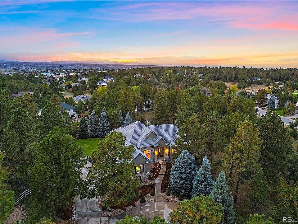 One of the most private lots in all of the coveted neighborhood of The Timbers. This ranch home is located on a corner lot, at the end of a cul-de-sac, set back with long circular driveway, heavily treed, and siding to open space. Owners have added an extra berm in the backyard with large mature trees lining the entire rear yard for maximum privacy. The professional landscaping has been chosen to provide the sense of serenity and a feel like you are in a forested mountain oasis. Enjoy a soak in the hot tub with stars above and complete privacy and calm. Interior is meticulously maintained and features an open floor plan, formal dining, vaulted ceilings, architectural archways, extensive kitchen with double oven, cooktop, stainless appls, granite counters, and hardwood and tile flooring. The primary suite on the main floor includes a private covered deck, fireplace, 5 piece, large walk-in, and adjacent office. Enjoy the sunset and mountain views from your extensive rear deck perfect for outdoor dining or entertaining. The curved staircase greets you when you first arrive and leads you to a walkout basement that is primed for entertaining. The walkout basement's interior is comprised of 3 bedrooms (1 is used for gym), full bath, huge rec room, wet bar, formal theater with projection and seating included, and a bonus room that was used as a studio. Walkout to a large concrete patio, expansive yard, private hot tub and lush professional landscaping. If you want a stunning custom home, with over an acre of land and tons of privacy ,this may very well be the one!