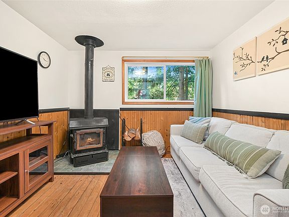 Charming cabin-style home, beautifully updated with rustic features and modern touches! This cozy retreat offers a sunny living room with a wood stove, a spacious primary bedroom, and a stylish kitchen with fresh white cabinetry and built-in shelving. Enjoy modern flooring, tongue-and-groove wood plank ceilings in the dining room, and a 3/4 bathroom. The wraparound covered porch, hot tub, sauna, and mature trees create a peaceful outdoor oasis. With a low-maintenance metal roof, ample off-street parking, and a prime location near Peaceful Valley and outdoor recreation, this is a perfect investment or Airbnb opportunity!