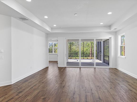 You will find upgrades to the Cabinetry, the Quartz in the Kitchen and Baths, Upgraded appliance package including a gas range with a double oven, and the French door Refrigerator. The 8 ft doors with the Matte Black door hardware is a distinguished look, along with upgraded base boards to the double door entry to the flex space which can easily transform this space into another bedroom if wanted or desired. Other electrical and lighting upgrades are strategic. The Oversized Lanai is all ready for a hot tub install if desired.