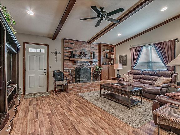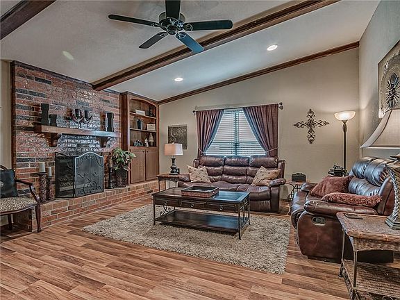 This fabulous home is move in ready! It features 3 large bedrooms, a spacious kitchen, large dining area, utility room with extra storage and pantry. The great living area includes a fireplace with gas logs and ceiling fan. The master bedroom is large with 2 closets and ceiling fan.The master bath is a true his and hers with separate vanities, jetted tub, and walk in closets. The beautiful backyard boasts a 10' X 8' outbuilding built in 2019 for extra storage, a covered patio, and a storm shelter. The roof, gutters, patio cover, and insulated garage door were replaced in 2019. The roof is a class 3 which will save on the home owners insurance! The windows were replaced in 2016 and are Low E vinyl. The HVAC was replaced in 2010. This great home is conveniently located to Tinker AFB, I-240, I-35, Shopping, restaurants, schools, and entertainment.