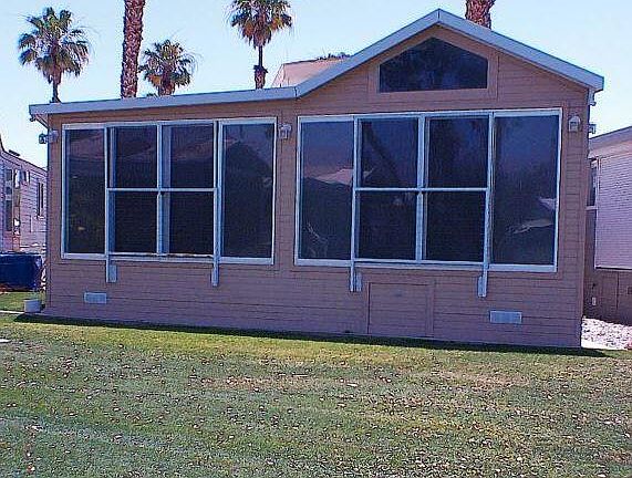 One of the BEST in Rancho Casa Blanca. This '97 Silvercrest is gorgeous with a CA Room. Upgrades! The Park Model is Located on the 18th Fairway with views of the pond and Chocolate Mtn's in the background. A spacious attached shed with W/D. Tile floors greet you at the door and just a couple of steps up to the CA Room with elegant furniture, TV, Fridge. The 'L' shaped room offers views to the golf course, Tee box and Green. Stepping inside to upgraded cabinetry with overhead art niches and shelves. Glass cabinet doors, granite counters and a eating area. Park Model/RV home in a 55+ RV Resort Community, Rancho Casa Blanca, where you own the land & is perfect for your winter hideaway. Rancho Casa Blanca (RCB) features a beautifully landscaped 80-acre property with 801 individual Park Model homes/or RV sites, Two large clubhouses that function as social hubs & 4 satellite buildings with laundry facilities, mailboxes, heated pools & relaxing spas. As an owner you will enjoy FREE GOLF on your 18-hole par 3 golf course, a 9-hole putting course, 2 practice chipping/putting greens, 6 heated pools/spas, 2 tennis courts, 8 pickle ball courts, shuffleboard courts, horseshoe pitch, fitness center & over 60 Clubs & Classes. This park has a limit of 270 day occupancy (not consecutive) out of 365 calendar year.