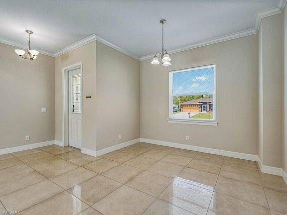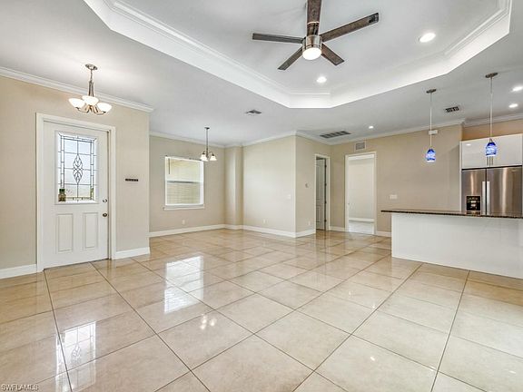 Built in 2015, this full three bedroom single family home is the ideal starter home and/or perfect for investment! At almost 1500 sq. ft of air conditioned living space, the spacious floor plan features 10 ft ceilings and 8 ft doors, 24" porcelain tile throughout the main living space, a contemporary kitchen complete with upgraded cabinetry, granite countertops, custom backsplash and stainless steel appliances. The primary bedroom features a tray ceiling, his and hers closets, double vanity in the primary bathroom. Indoor laundry room with sink. The pavered lanai in the backyard provides additional space for outdoor living. FULL HURRICANE PROTECTION with impact doors and windows! NEW ROOF 2023! FRESHLY PAINTED inside and out 2024! Ideally located at the north end of San Carlos Park, close to Gulf Coast Shopping Center, SWFL International Airport, Florida Gulf Coast University.