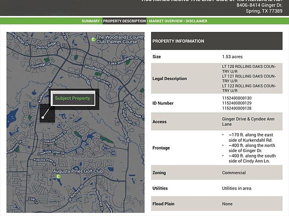 Prime development opportunity in the heart of Woodlands/Creekside! Ginger Lane offers a spacious and level lot situated just off Kuykendahl Rd in the highly desirable 77389 zip code. This versatile parcel presents the perfect canvas for a wide range of commercial or residential projects—including luxury townhomes, multifamily units, a retail shopping center, car wash, or flex office space.