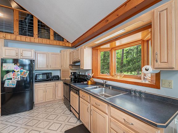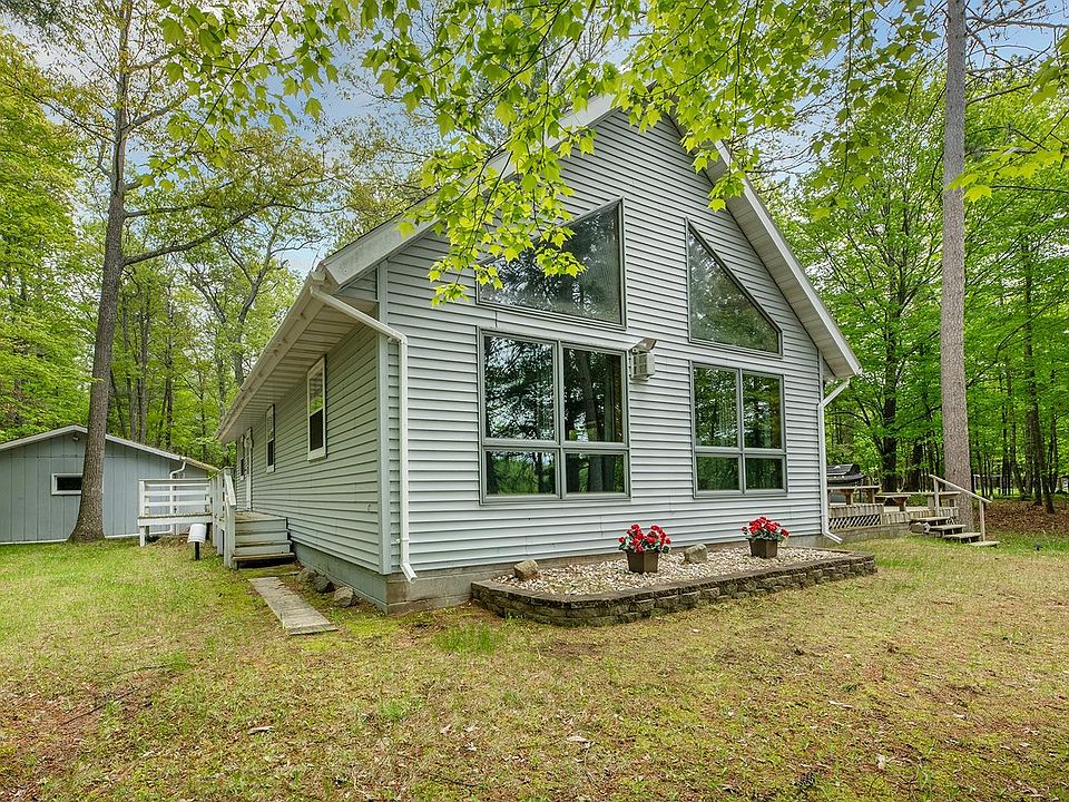 Nestled between Eagle River and Three Lakes, this adorable 1.5 story home offers 200 feet of frontage on Squash Lake. The main level boasts an open-concept layout featuring vaulted ceilings and a breathtaking wall of windows facing southwest, ensuring perfect sunsets in the evenings. With two cozy bedrooms and a full bath on the main floor, plus a versatile loft, this home is both inviting and spacious. The fully finished lower level includes a bonus room, family room, and a convenient half bath. Outdoor living is a delight with an open sun deck and a secondary deck overlooking the tranquil lake. Additional amenities include a detached one-car garage, a circular driveway, and a handy shed, making this property an ideal retreat for both relaxation and entertaining.