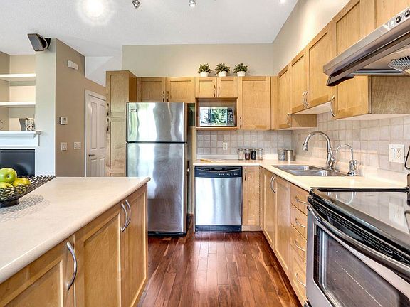 Welcome to this idyllic family home in a tranquil setting that will make you feel like you are away from it all, while being close to everything you need! This exterior end-unit home located on a cul-de-sac offers formal living & dining areas perfect for entertaining w/ gas fireplace; kitchen feat. an island & plenty of storage; casual dining w/ access to large balcony; + a family room w/ 2nd fireplace & built in speakers. Upper level feats. a peaceful main bedroom w/several closets incl. walk-in & ensuite w/ double sinks; 2 more bedrooms; plus full bath. A 4th bed/theatre room/flex, laundry room, storage & 3rd bathroom on lower level w/ access to an attached double garage. All in a friendly community next to trails & near community centre, schools, parks & more!