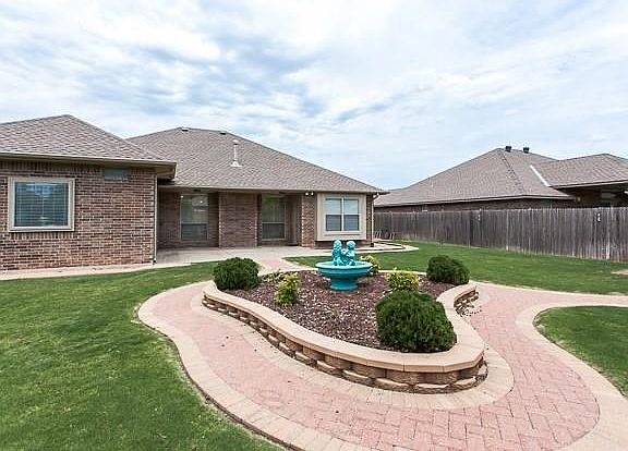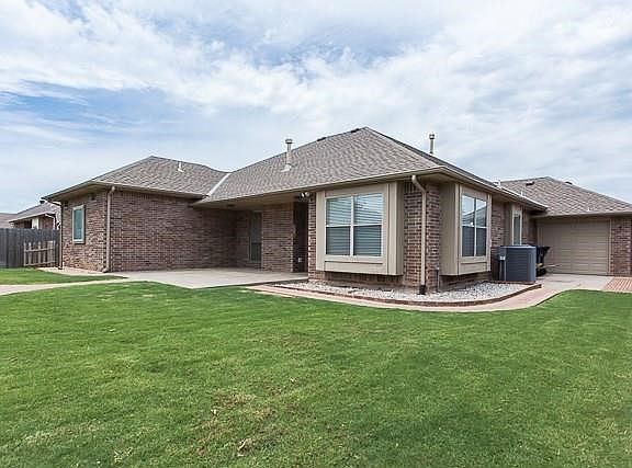 3 bed, 2 bath, office (has nice closet, could be 4th bed), pantry, 3 car garage with STORM SHELTER, plus pass through garage door leading to back yard. Semi-open concept boasts cathedral ceiling, built-ins, and gas burning fireplace in the great room. Master features 10 ft. ceilings, whirlpool tub, and two walk-in closets. Large pantry, eat-in kitchen, and underground sprinkler system for yard and flower beds. Retreat to the backyard to enjoy your own oasis in the heart of the City. Easy access to the Kilpatrick turnpike, restaurants, and nearby shopping.