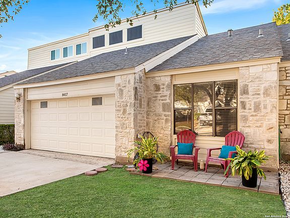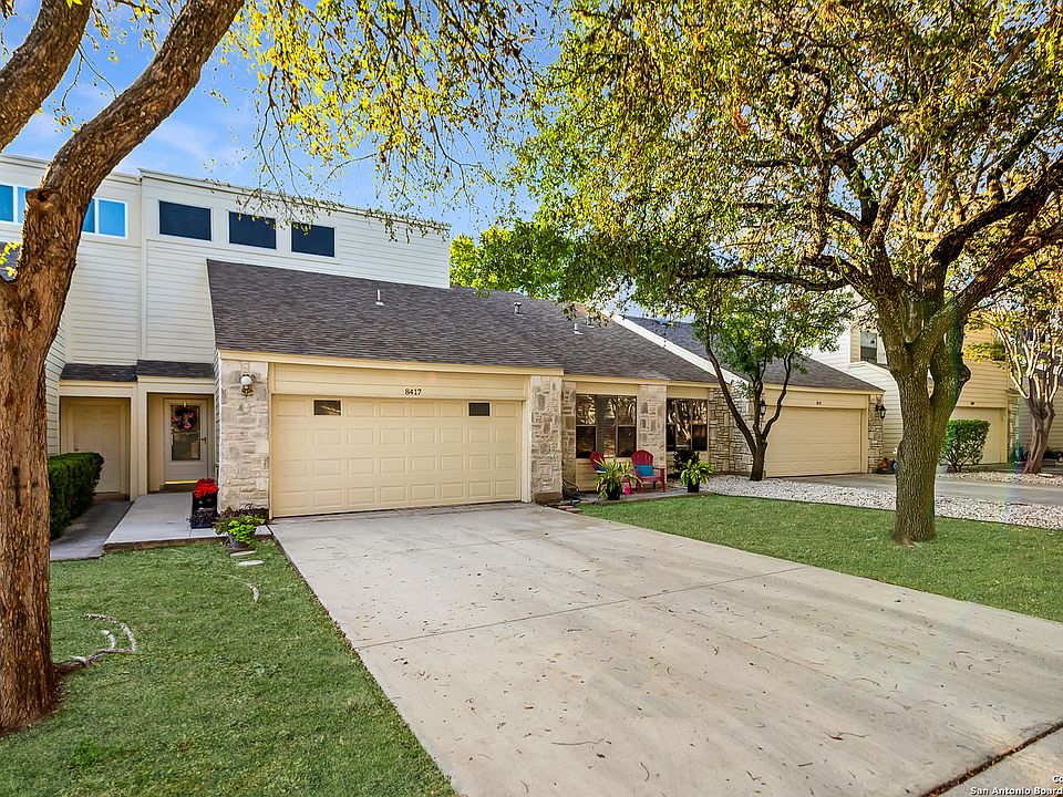 Beautifully updated and move-in ready, this single-story 2-bed 2-bath townhome combines modern upgrades with a highly desirable central location. Tucked inside a quiet, gated community with mature trees and open green spaces, this home delivers comfort, privacy, and style throughout. Step inside to soaring high ceilings and abundant natural light. Both bedrooms feature private en-suite bathrooms, making the floorplan perfect for homeowners who value convenience, guests, or a roommate setup. Recent renovations elevate the entire property, including: new flooring throughout, fresh light & modern interior paint, upgraded lighting & ceiling fans, granite countertops in both the kitchen & bathrooms, and additional improvements throughout the home. Enjoy morning coffee or evening relaxation on the patios overlooking the green space, framed by beautiful shade trees and offering a peaceful view of the tennis court. A two-car garage plus an extended driveway provide generous parking, a rare benefit in a townhome setting. Location sets this home apart-minutes from USAA and the Medical Center and with quick access to 1604, 410, I-10, and Wurzbach Parkway. Whether commuting, dining out, or running errands, everything you need is close, making this an unmatched opportunity for convenience and ease of living. Future potential awaits as well, attic space has been partially prepared for finish-out and could become a fantastic bonus room, office, or even a third bedroom.
