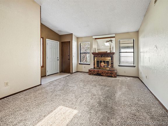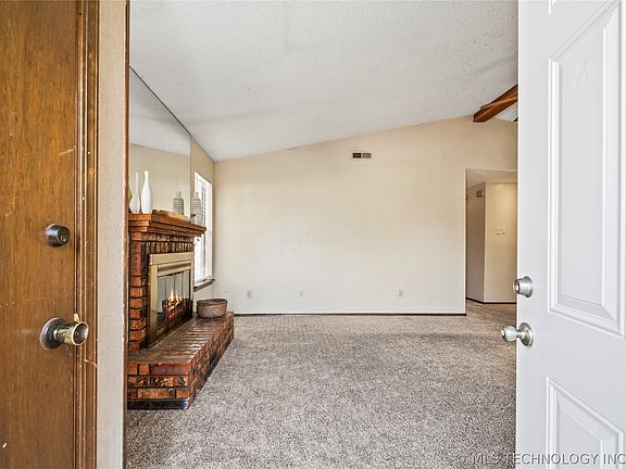 Two bedroom starter or investment property in the heart of Owasso. Living room with 12ft vaulted ceiling & brick fireplace--open to the kitchen & dining. Kitchen has cute bar & updated Frigidaire appliances, incl fridge. new microwave. Roomy dining area. Master has dressing area w/sink & lg closet. Great cov'd patio off the master BR. Ceiling fans in bedrooms & living. Backyard has privacy fencing--some of it is new, including the gate. Garage has electric overhead door & work area with bench. Lots of parking space on the extended driveway. Waiting on new buyer to add a little updating to make a cute starter home or rental.