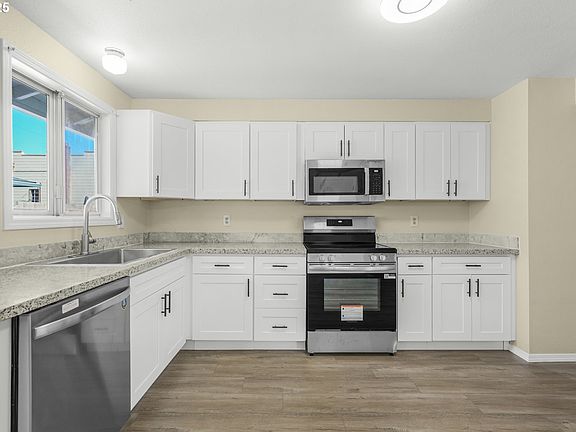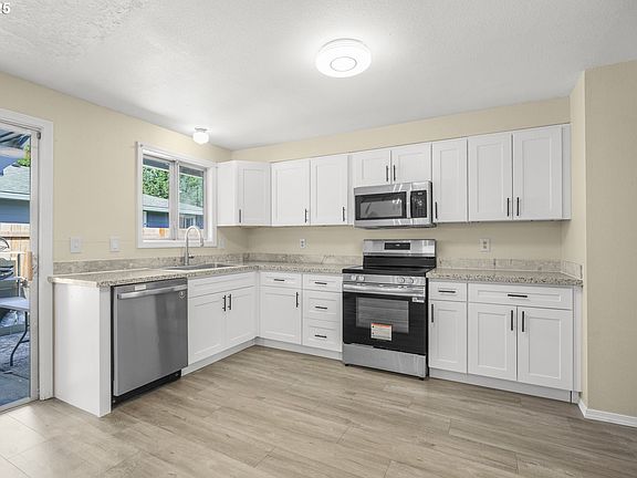 Beautifully remodeled ranch-style home featuring 3 bedrooms and 1.1 baths, blending comfort and modern updates. Enjoy stylish flooring throughout and a spacious living room with a striking floor-to-ceiling wood-burning fireplace and a large picture window that fills the space with natural light. The open layout flows seamlessly to the dining area with sliding doors to a generous backyard patio that's ideal for outdoor living and entertaining. The kitchen is a standout with new stainless steel appliances, granite countertops, and great counter and cabinet space. The primary bedroom offers double closets and a private half bath, while two additional bedrooms share a full bath with a tub/shower combo. The fully fenced backyard is low-maintenance and offers a large patio space for relaxing or gatherings. Located just minutes from shopping, dining, parks, and schools, with excellent walk and bike scores, this home offers both convenience and charm. [Home Energy Score = 2. HES Report at https://rpt.greenbuildingregistry.com/hes/OR10239162]