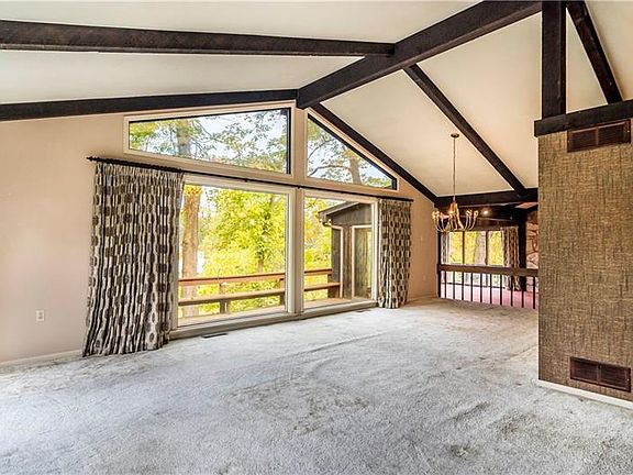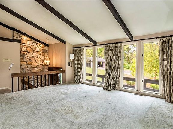 Lovely Mid-Century Contemporary style home nestled on gorgeous 2.2 acres in a country setting yet close and convenient to many amenities. The builder/owner home has many special features such as walls of windows with breathtaking views of nature/trees giving a feeling of being enveloped in your own treehouse. The easy flow floor plan begins with rustic stone entry leading to a spacious LR, DR and FR with soaring ceilings and wood beams. The FR provides a stone FP to warm Winter nights and sliders to a side deck. A den with a FP leads to a breakfast area with slider to an enclosed patio and additional decks. The well-equipped kitchen offers wood cabinetry and tiled flooring. The master en-suite has 2 closets, FP plus a bathroom with dressing area. 2 additional BR's plus full bath finish main level. LL offers a 2-car tandem garage, half bath and GR with pool table. Home has much to offer including a DETACHED 3 CAR GARAGE, Home needs a little TLC but is so special with many possibilities.