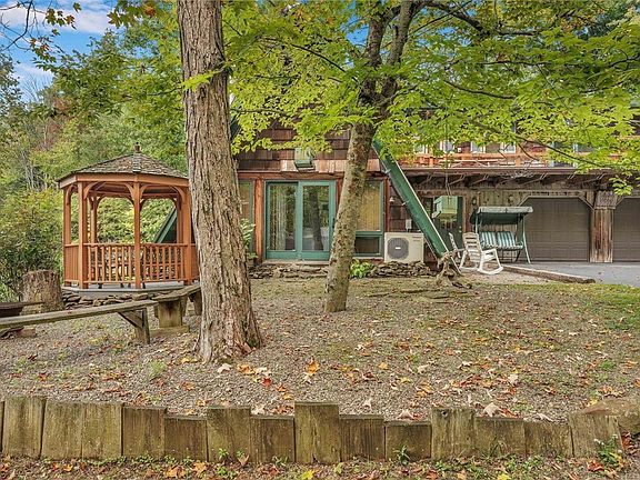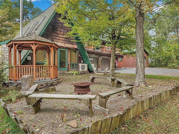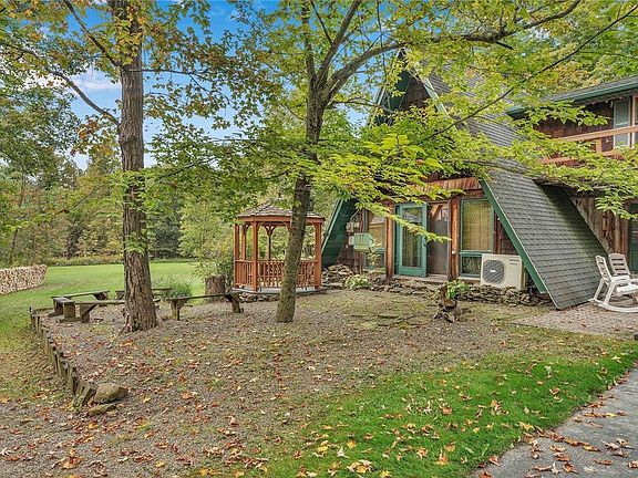Beautiful location for this secluded AFrame home. 11.7 acres with trails, woods, and beautifully groomed. Open floor plan for kitchen, living room and dining room. New kitchen with rustic Hickory cabinets, w/quarts contertoips. Breakfast bar, and all stainless steel appliances included. Newer bath with walkin-shower, First floor laundry, and first floor bedroom. 2nd floor features 3 bedrooms and full bath Plus large family room with sliding glass door leading to covered open porch on the 2nd level. Overlook the living room from the loft with 6 natural skylights and sliding glass door leading to the Gazebo. Lots of garage space with 2 car garage, large breeeway leading to newer additional 2 car garage. Blacktop drive with additional u shaped gravel driveway for plenty parking Heat with 2 wood stoves or Arcade electric which is very reasonable mini split a/c in living room. 2 sheds for storage and beautiful yard. Owner leaving all wood that is cut for wood stoves. Also extra refigerator in garage. Bring your hunting gear and ATV and enjoy. Open house 9/28 1-3 Delayed negotions Thursday October 3 at 2:00 pm